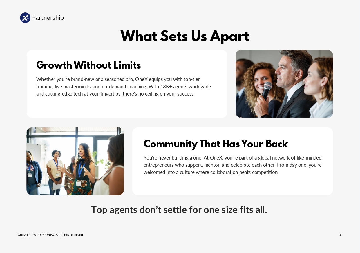 Whether you're brand-new or a seasoned pro, OneX equips you with top-tier training, live masterminds, and on-demand coaching. With 13K+ agents worldwide and cutting-edge tech at your fingertips, there's no ceiling on your success.